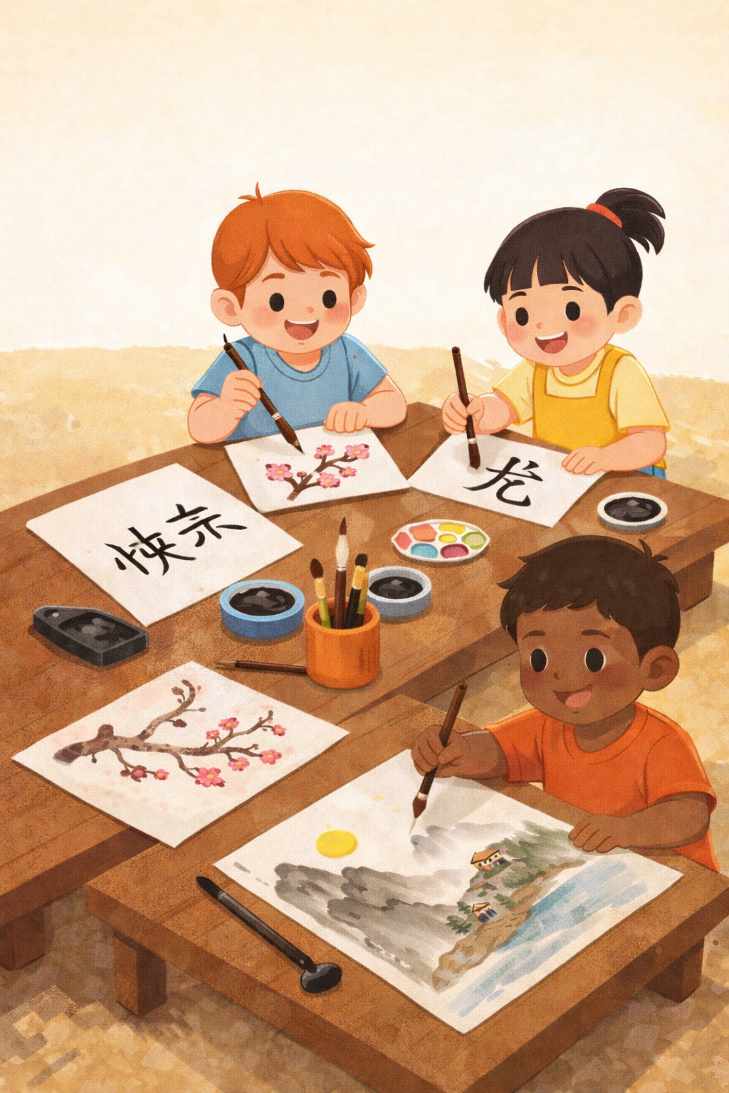 In this integrated art session, students explore both calligraphy and ink painting using traditional brush techniques.